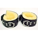 Sheepskin Lined Black Leather Wrist / Ankle Restraints CuffsThis pair of black genuine leather wrist or ankle restraint cuffs have thick sheepskin inner linings to provide you with the ultimate in comfort. They have large chrome plated D rings for use as restraints. The D rings are kept in place by 6 heavy duty studs, so they'll be sure to hold in place. They are 2 1/2 inches wide, have a buckle style clasp and are adjustable from 7 inches to 11 inches.These restraint cuffs are great for home use, or just for a cool look at nightclubs. These won't last long, so don't miss out. Get yours now!